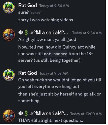 She tried to go and "apologize" for what she did but, My friends told me after she was STILL continuing to talk shit. Ponytown if you don't want a 15 year old going onto you're 18+ servers then you need to make it CLEAR. Espically Quinn. And I know for a FACT you have gotten over multiple reports about her today. I know she's on you're watch list for being a minor. She's still 12. And it is not stopping, she contiuously keeps making new accounts and changing her age to make it seem like she's an adult.